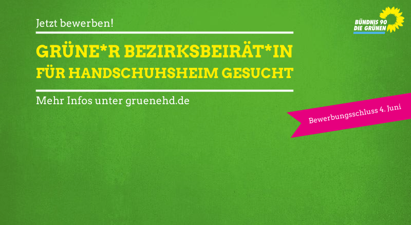 Ein Sitz im Bezirksbeirat Handschuhsheim ist frei geworden. Alle Interessierten, die gerne für die Grünen im Bezirksbeirat Handschuhsheim mitarbeiten wollen, können sich unter der Mailadresse geschaeftsstelle@gruene-fraktion.heidelberg.de bewerben.