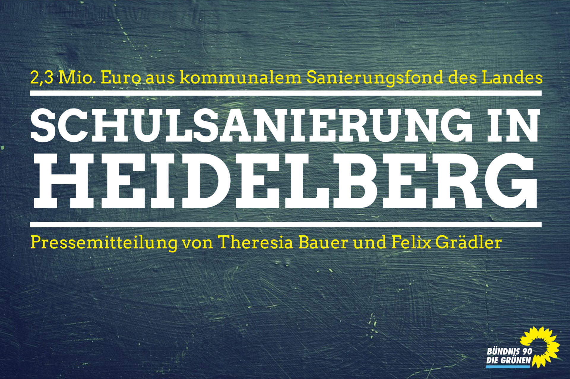 Dazu sagt die Heidelberger Landtagsabgeordnete Theresia Bauer: „Das Förderprogramm ist eine echte Zukunftsinvestition und eine Investition in gute Bildung. Mit der schlagkräftigen Summe von insgesamt über einer halben Milliarde Euro greifen wir den Kommunen landesweit unter die Arme, damit sie die Mängel in den Schulen rascher und effektiver beseitigen können.“