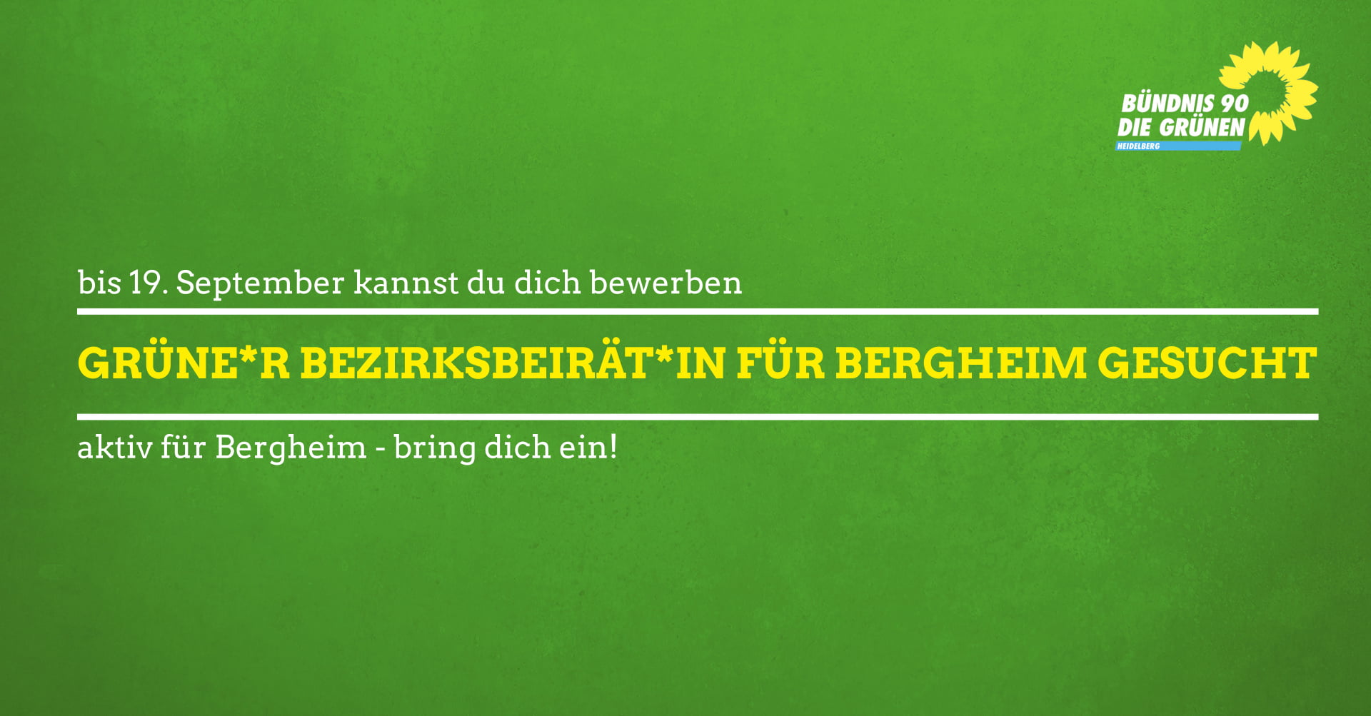 Ein Sitz im Bezirksbeirat Bergheim ist frei geworden. Alle Interessierten, die gerne für die Grünen im Bezirksbeirat Bergheim mitarbeiten wollen, können sich unter der Mailadresse geschaeftsstelle@gruene-fraktion.heidelberg.de bewerben.