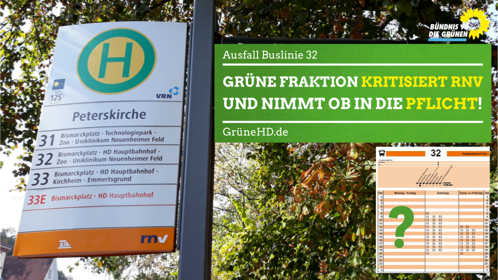 Wegen der Bauarbeiten am Bahnhof hat die Rhein-Neckar-Verkehr GmbH (RNV) die Buslinie 32 zwischen Hauptbahnhof und Altstadt von Montag bis Freitag eingestellt (RNZ-Bericht vom 13.10.2018). Als Grund für die Fahrtausfälle nennt die RNV Personalmangel. Ein unhaltbarer Zustand für die grüne Gemeinderatsfraktion. Sie kritisiert die RNV in einer Pressemitteilung scharf und nimmt Oberbürgermeister Eckart Würzner in die Pflicht.