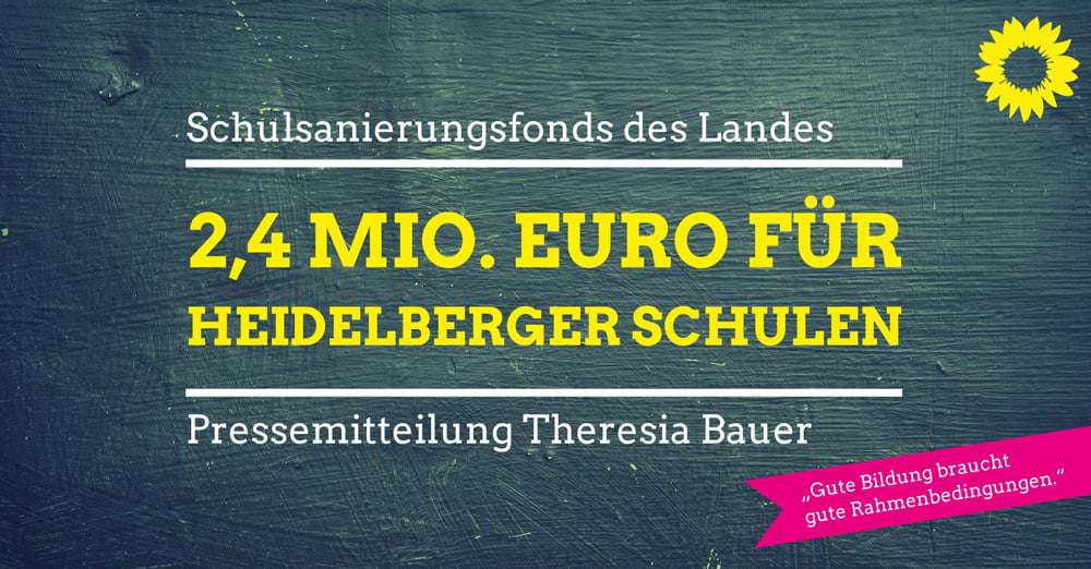 Die Heidelberger Landtagsabgeordnete Theresia Bauer dazu: „Es ist wichtig und richtig, dass diese Maßnahmen vom Land unterstützt werden. Der Sanierungsbedarf in Heidelberg ist ohne Frage dringend und groß. Fenster und Dächer müssen renoviert, Schultoiletten saniert, Datenleitungen verlegt, Computerräume erneuert und in Brandschutzmaßnahmen investiert werden.“
