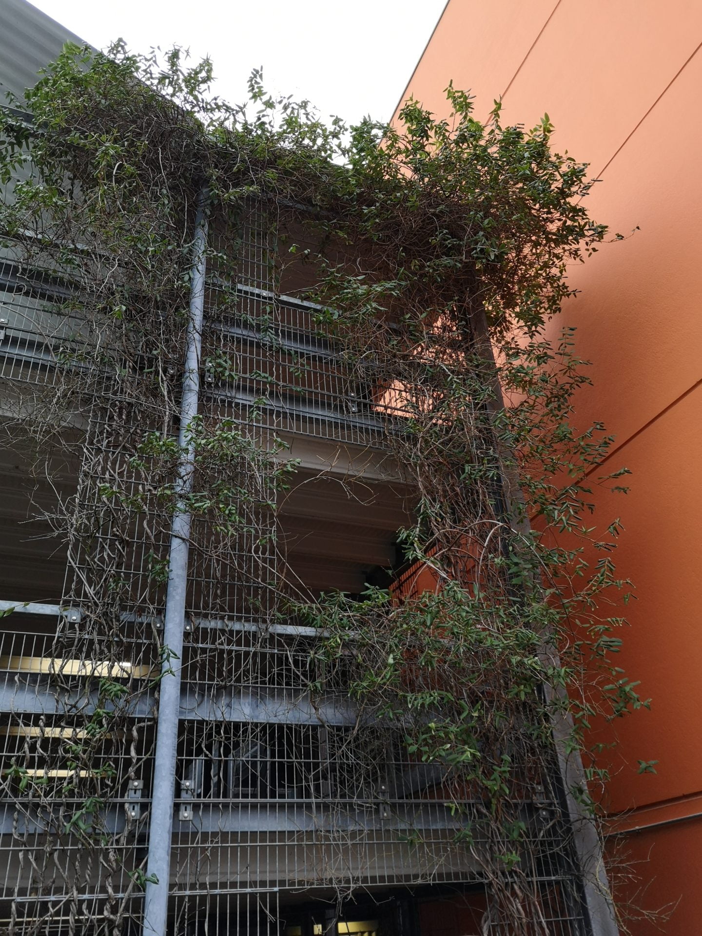 Ein großes Plus der Fassadenbegrünung ist auch, dass sie nicht in Flächenkonkurrenz zu Gebäuden steht. Der starke Zuzug in Ballungsgebiete sorgt für Nachverdichtungen und dies meist zum Nachteil von Stadtgrün. Hier kann das Grün an der Außenwand Abhilfe schaffen. Und es gibt so gut wie keine Fassade, für die es nicht eine Begrünungsmöglichkeit gibt. Wetzel verwies auf die Kinderklinik, sogar dieses weithin wegen ihrer ansprechenden Fassade gelobte Gebäude ist an der Seite mit Rankpflanzen versehen. Hohe graue Aufzugschächte werden durch Efeu regelrechte Hingucker, an anderen Fassaden liefert er sich mit Wildem Wein einen Wettbewerb, wer als erster ganz oben ist – wir verraten es: der Wilde Wein hat gewonnen.